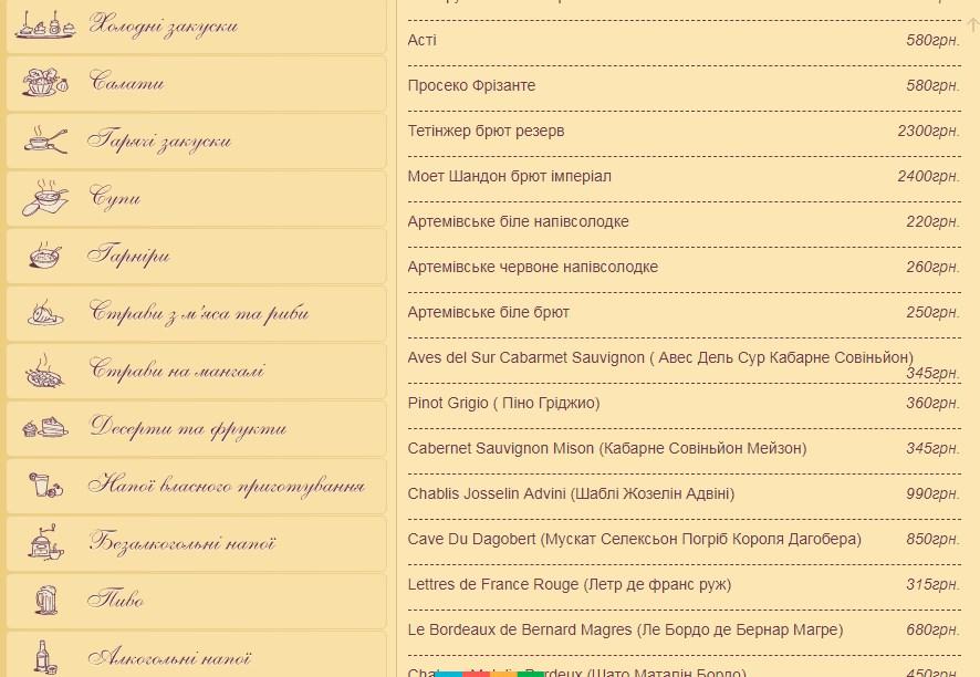 В меню ресторана предлагают холодные, горячие блюда, закуски, первые и вторые блюда, блюда на мангале, блюда из мяса и рыбы, гарниры, салаты, десерты и фрукты, вкусное мороженое и напитки собственного производства, алкогольные и безалкогольные напитки, вино и т.д. .