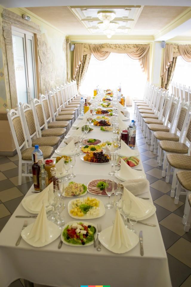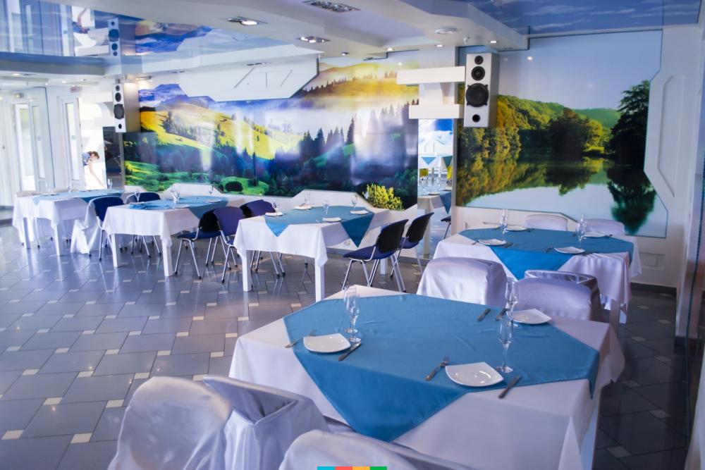 "Терра" - це ресторан з смачними різноманітими стравами української та європейської кухні. Приміщення ресторану налічує два просторих банкетних зали, в яких панує атмосфера затишку та комфорту. В одному залі може розміститись до 100 осіб а у іншому до 300 осіб. При бажанні є можливість замовити музичний супровід Вашого свята. Ресторан "Терра" стильного інтер`єру та гарного оформлення чудово підходить для святкувань великого весілля, урочистих банкетів, корпоративних вечірок, день народження тощо. При святкуванні весілля графік ресторану продовжується до 04:00.